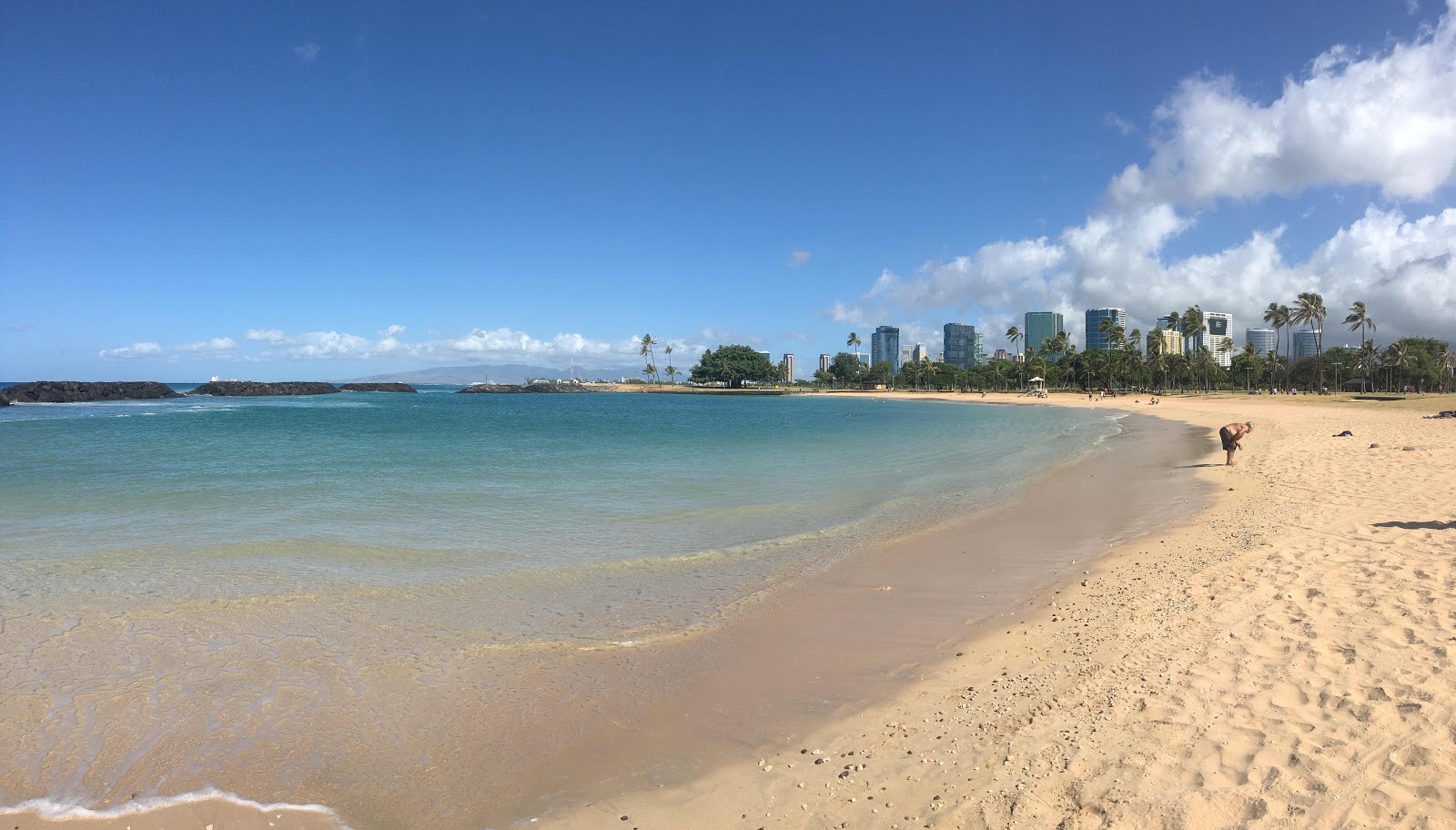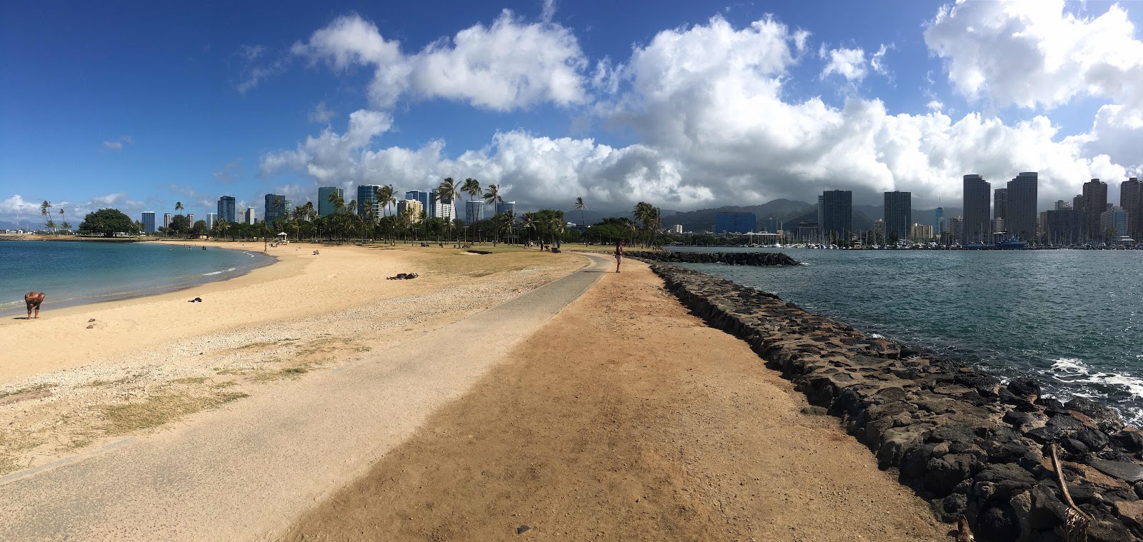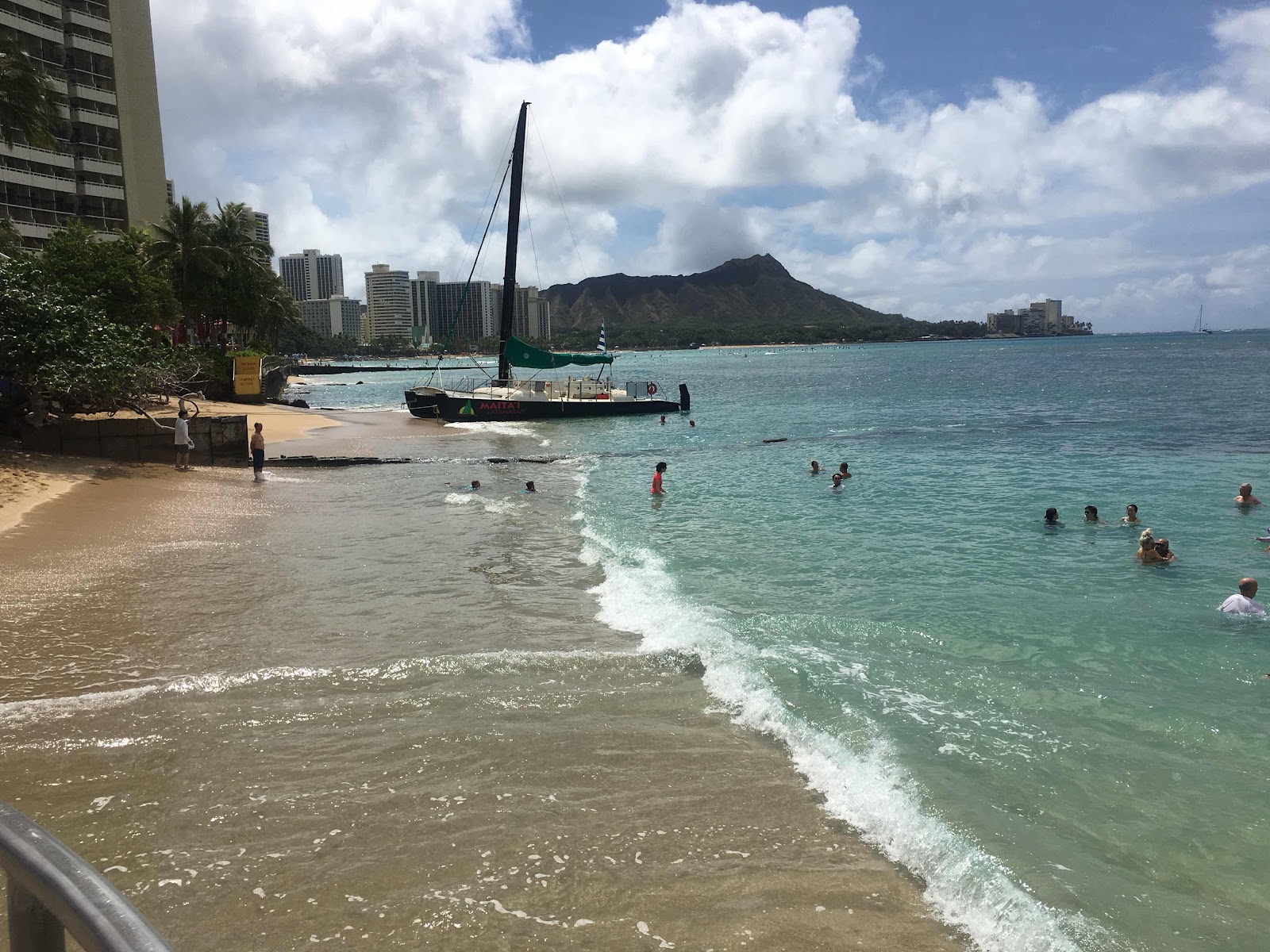 Our walk the other morning along the boardwalks to main beach Waikiki. Diamond head in the far distance.