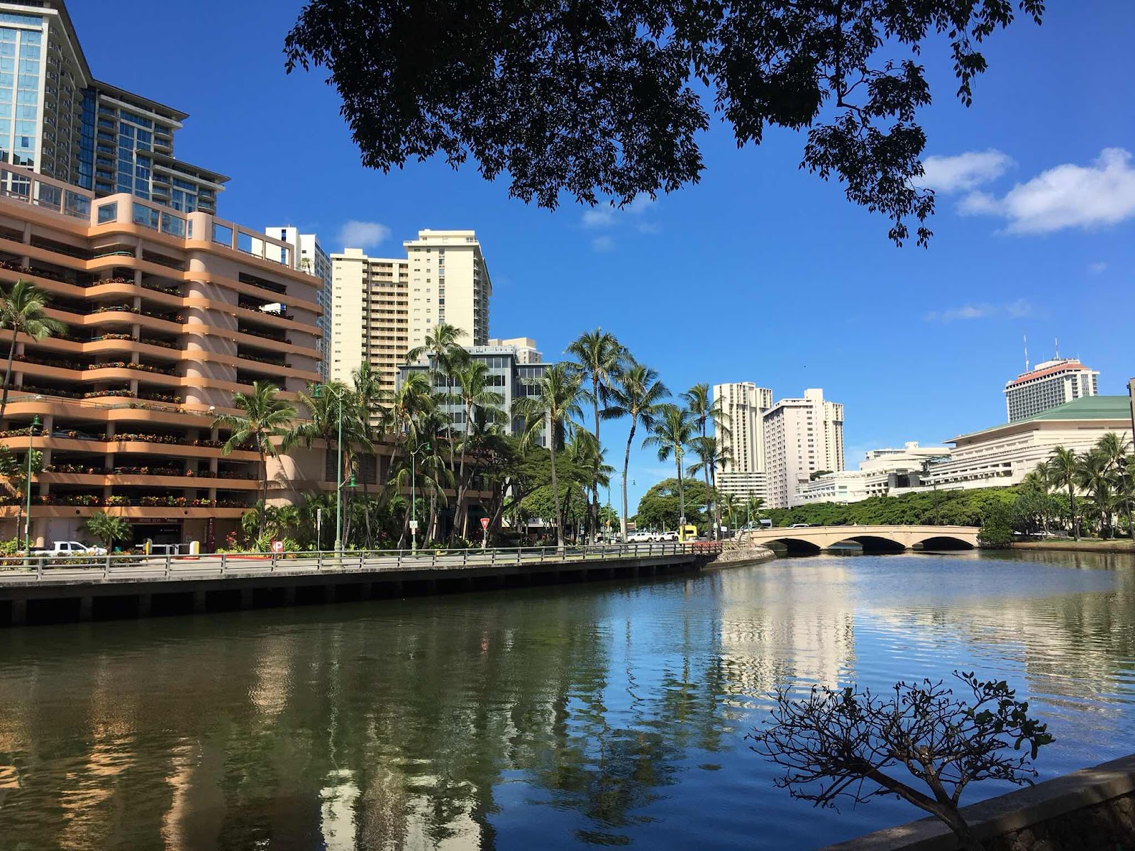 Walking  round to the beach were we go most days in the afternoon. The Ilikai Hotel the Y shape building on the left. We then have to walk around this lagoon to get to our swimming beach.