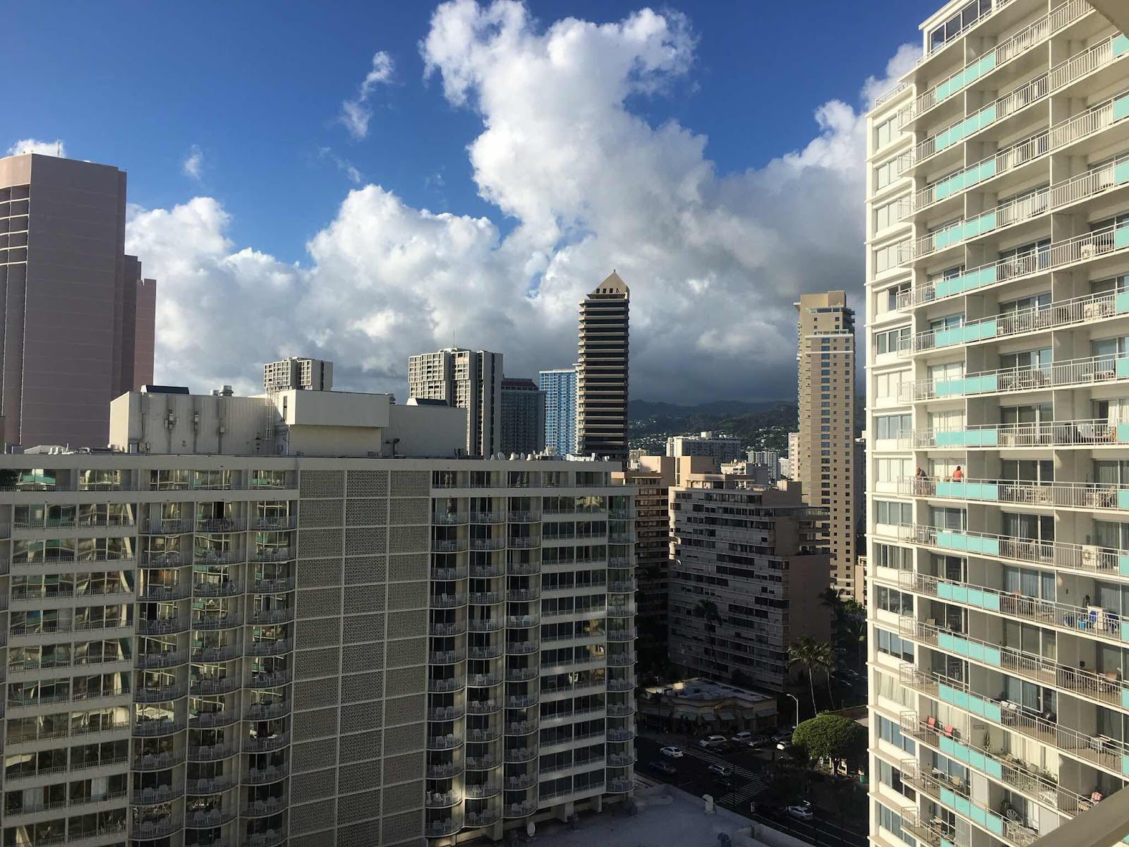 Ilikai far left, then the Hilton lagoon and to the right the beach where we swim.